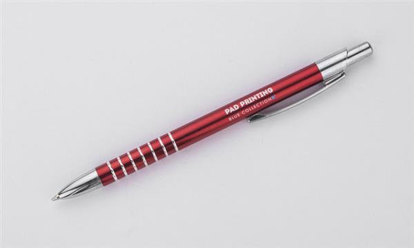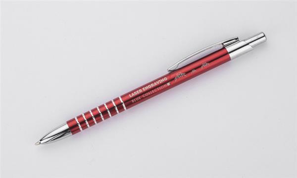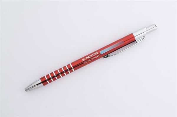 Prosty długopis wykonany z aluminium ozdobiony szerokimi ringami. Logo wygrawerujemy.