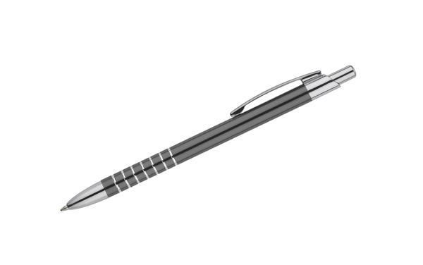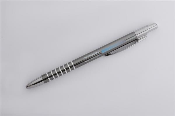 Prosty długopis wykonany z aluminium ozdobiony szerokimi ringami. Logo wygrawerujemy.
