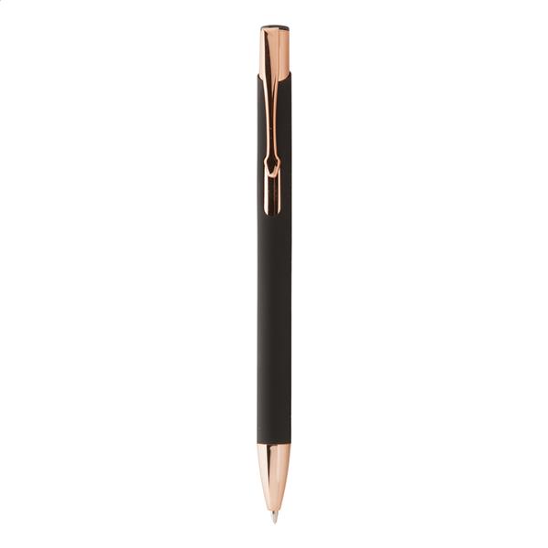 Długopis z aluminium pochodzącego z recyklingu z gumowanym wykończeniem i elementami w kolorze różowego złota. Ze specjalną powłoką pod grawer lustrzany w kolorze różowego złota. Niebieski wkład.