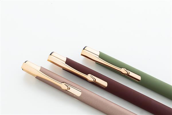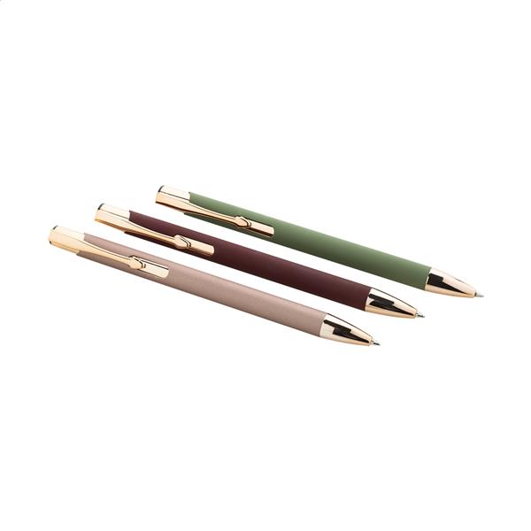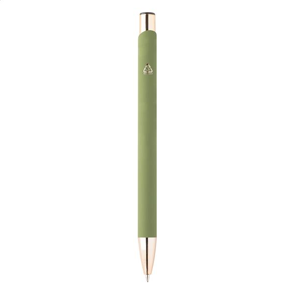 Długopis z aluminium pochodzącego z recyklingu z gumowanym wykończeniem i elementami w kolorze różowego złota. Ze specjalną powłoką pod grawer lustrzany w kolorze różowego złota. Niebieski wkład.