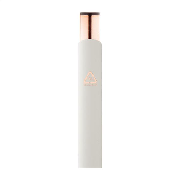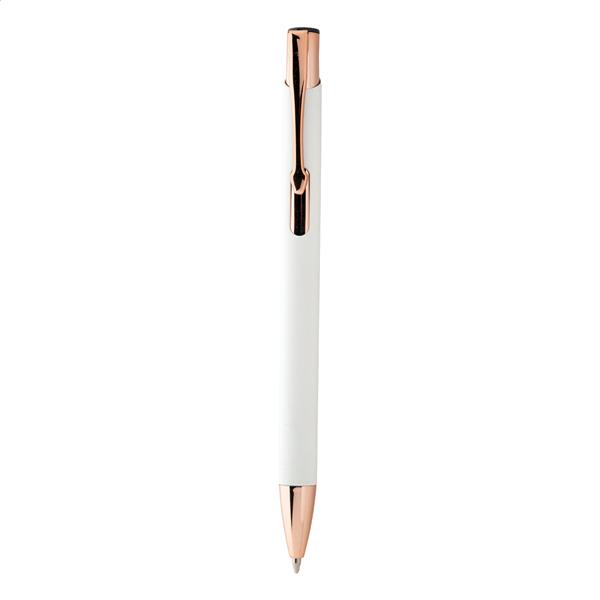Długopis z aluminium pochodzącego z recyklingu z gumowanym wykończeniem i elementami w kolorze różowego złota. Ze specjalną powłoką pod grawer lustrzany w kolorze różowego złota. Niebieski wkład.