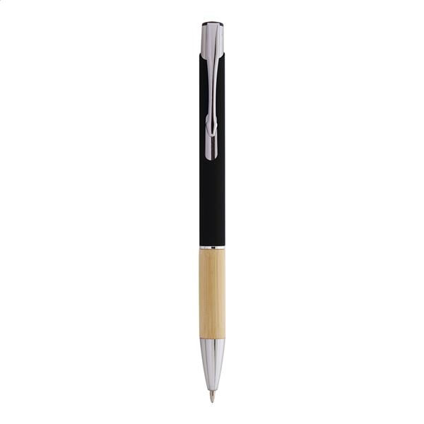 Aluminiowy długopis z bambusowym uchwytem, gumowanym wykończeniem i niebieskim wkładem. Ze specjalną powłoką pod grawer lustrzany.