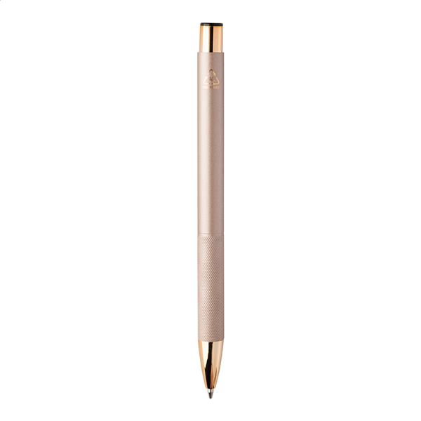 Długopis z recyklingowanego aluminium z matowym wykończeniem, teksturowanym uchwytem i detalami w kolorze różowego złota. Ze specjalną powłoką do lustrzanego grawerowania laserowego w kolorze różowego złota. Z niebieskim wkładem.