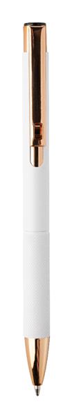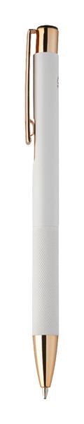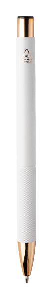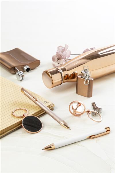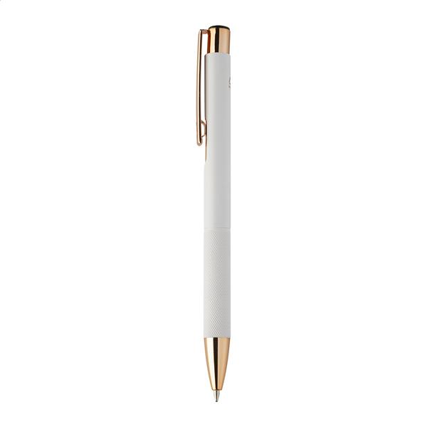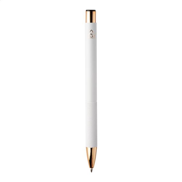 Długopis z recyklingowanego aluminium z matowym wykończeniem, teksturowanym uchwytem i detalami w kolorze różowego złota. Ze specjalną powłoką do lustrzanego grawerowania laserowego w kolorze różowego złota. Z niebieskim wkładem.