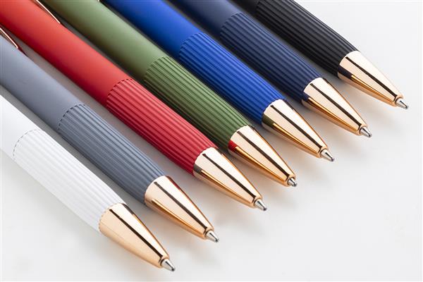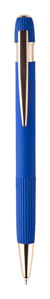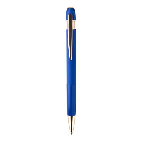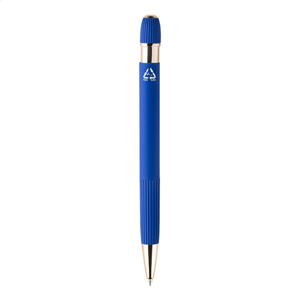 Długopis z recyklingowanego aluminium z gumowaną obudową i detalami w kolorze różowego złota. Ze specjalną powłoką do lustrzanego grawerowania laserowego w kolorze różowego złota. Z niebieskim wkładem.