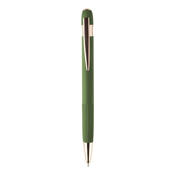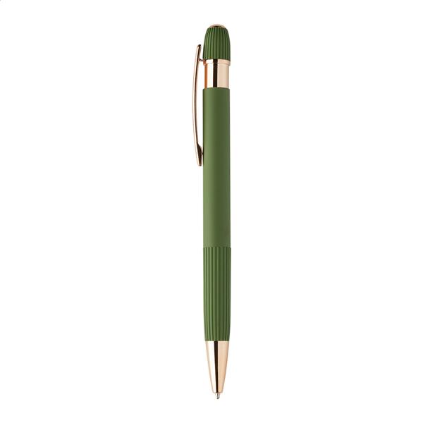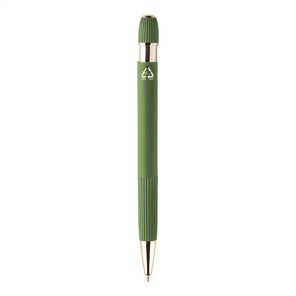 Długopis z recyklingowanego aluminium z gumowaną obudową i detalami w kolorze różowego złota. Ze specjalną powłoką do lustrzanego grawerowania laserowego w kolorze różowego złota. Z niebieskim wkładem.