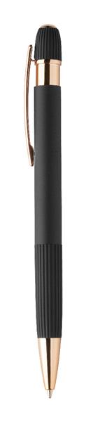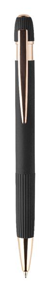 Długopis z recyklingowanego aluminium z gumowaną obudową i detalami w kolorze różowego złota. Ze specjalną powłoką do lustrzanego grawerowania laserowego w kolorze różowego złota. Z niebieskim wkładem.