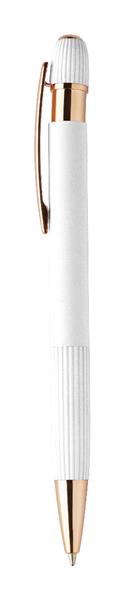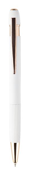 Długopis z recyklingowanego aluminium z gumowaną obudową i detalami w kolorze różowego złota. Ze specjalną powłoką do lustrzanego grawerowania laserowego w kolorze różowego złota. Z niebieskim wkładem.