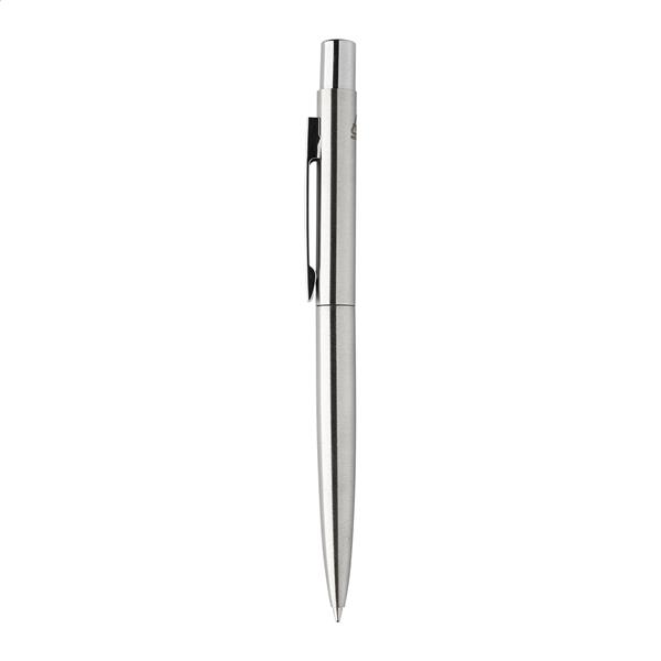 Długopis z recyklingowanej stali nierdzewnej z chromowanymi detalami. Z niebieskim wkładem.