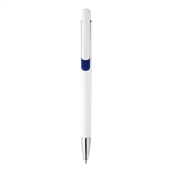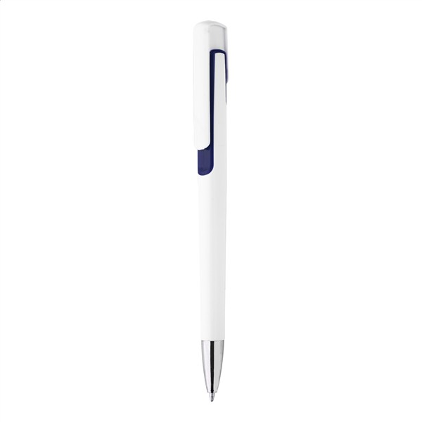Plastikowy długopis z kolorowymi wykończeniami i chromowaną końcówką. Z niebieskim wkładem.