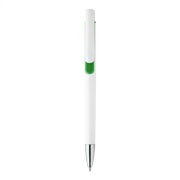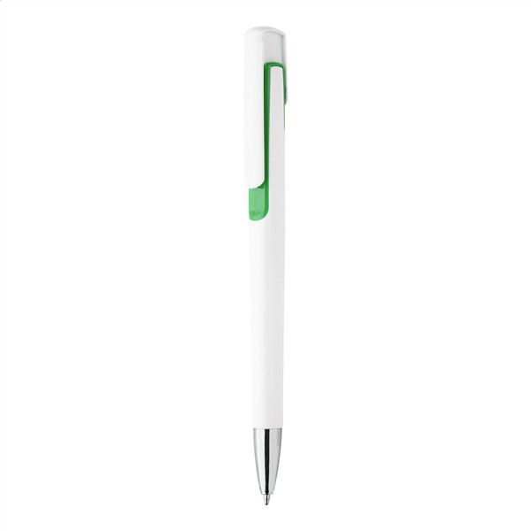 Plastikowy długopis z kolorowymi wykończeniami i chromowaną końcówką. Z niebieskim wkładem.
