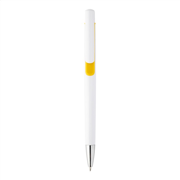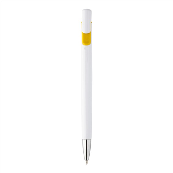 Plastikowy długopis z kolorowymi wykończeniami i chromowaną końcówką. Z niebieskim wkładem.