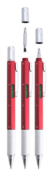 Plastikowy długopis ze śrubokrętami płaskimi i gwiazdkowymi, poziomicą i linijką 7 cm/3 cale. Z metalowym klipem i niebieskim wkładem.
