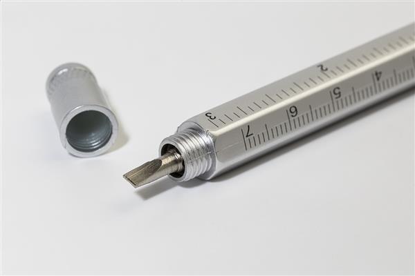 Plastikowy długopis ze śrubokrętami płaskimi i gwiazdkowymi, poziomicą i linijką 7 cm/3 cale. Z metalowym klipem i niebieskim wkładem.