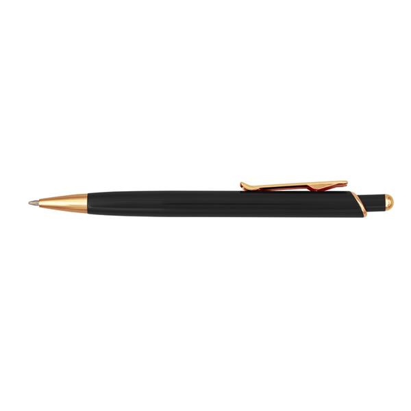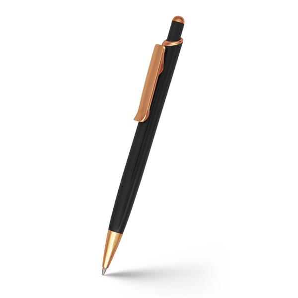 Długopis z kolorowym trzonem i błyszczącymi elementami kolorze różowego złota, wkład w niebieskim kolorze, grawer ukazuje powierzchnię w kolorze złotym, produkt wykonany z aluminium