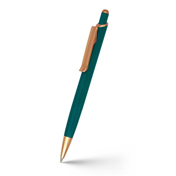 Długopis z kolorowym trzonem i błyszczącymi elementami kolorze różowego złota, wkład w niebieskim kolorze, grawer ukazuje powierzchnię w kolorze złotym, produkt wykonany z aluminium