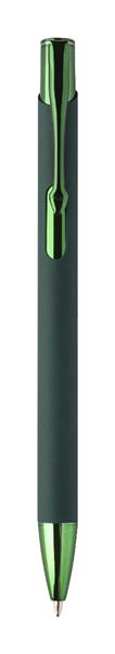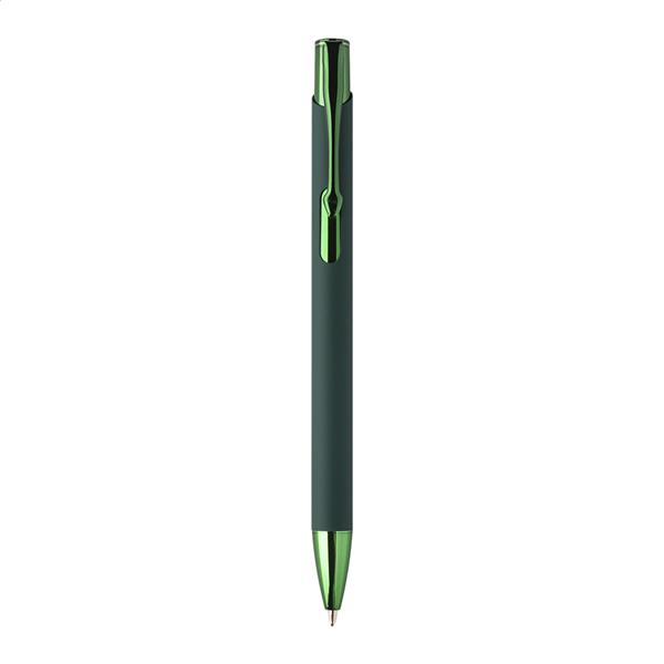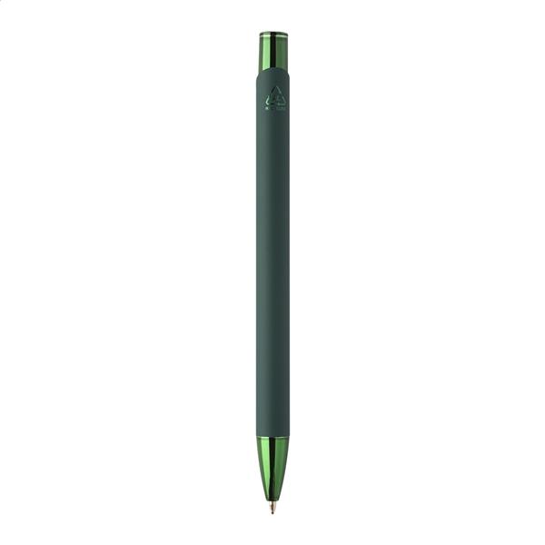 Długopis z recyklingowanego aluminium z gumowaną obudową i kolorowymi, błyszczącymi, metalowymi elementami. Ze specjalną powłoką do lustrzanego grawerowania, pasującą do metalowych elementów. Z niebieskim wkładem.