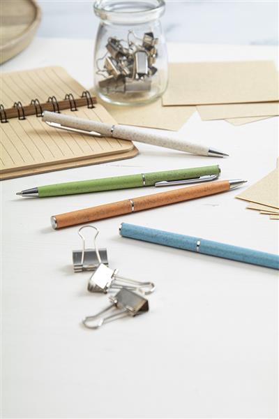 Ekologiczny, plastikowy długopis z przekręcanym mechanizmem ze słomy pszenicznej z chromowanymi elementami. Niebieski wkład.