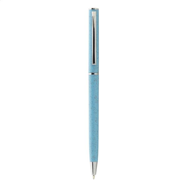 Ekologiczny, plastikowy długopis z przekręcanym mechanizmem ze słomy pszenicznej z chromowanymi elementami. Niebieski wkład.