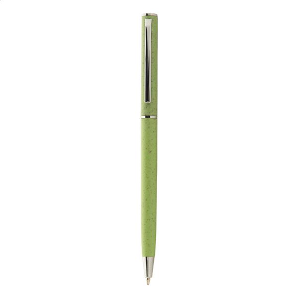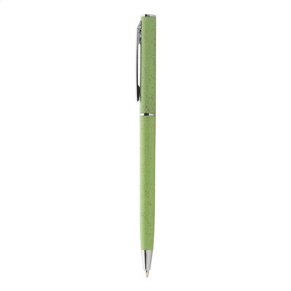 Ekologiczny, plastikowy długopis z przekręcanym mechanizmem ze słomy pszenicznej z chromowanymi elementami. Niebieski wkład.