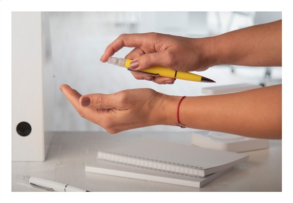 Plastikowy długopis z niebieskim wkładem i dozownikiem w sprayu. Pojemność 3ml. Dostarczany bez płynu.