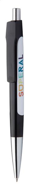 Plastikowy długopis z błyszczącymi chromowanymi elementami i dużą powierzchnią nadruku na korpusie. Niebieski wkład.