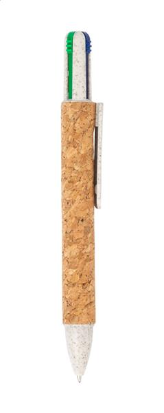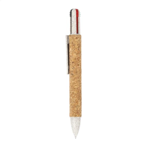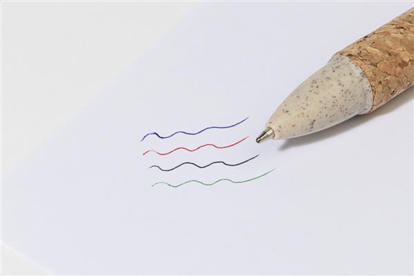 Ekologiczny plastikowy długopis ze słomy pszenicznej z korpusem pokrytym naturalnym korkiem. Z 4 kolorowymi wkładami: czarnym, niebieskim, zielonym i czerwonym.