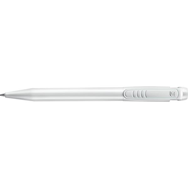 Długopis Stilolinea, biały trzon, kolorowy, szeroki klip, wkład w niebieskim kolorze, zawiera tusz German Dokumental Ink, produkt wykonany z ABS, plastiku, niklu i metalu