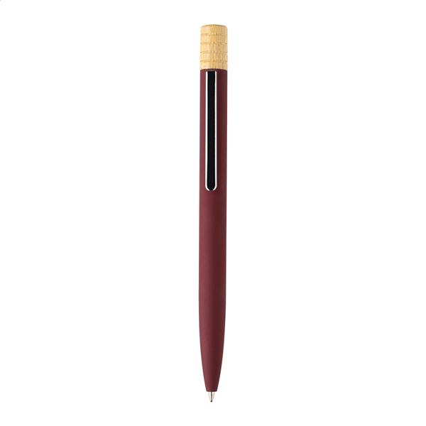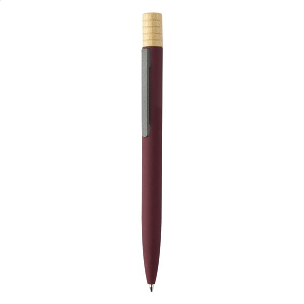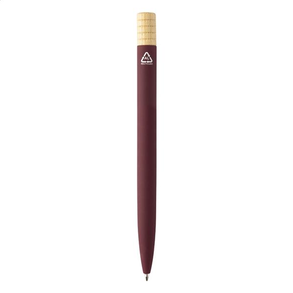 Długopis przekręcany z aluminium z recyklingu z klipem w kolorze gunmetal i bambusowym przyciskiem. Z niebieskim wkładem. W pudełku z papieru kraft.