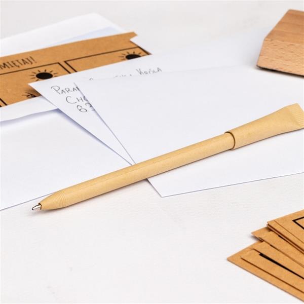 Ekologiczny długopis tekturowy z wkładem piszącym na niebiesko.