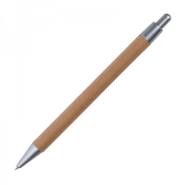 Długopis automatyczny w ekologicznej wersji, bo wykonany z kartonu pochodzącego z recyklingu. Długopis tekturowy, posiada wkład piszący na niebiesko oraz zawiera srebne elementy ozodobne.