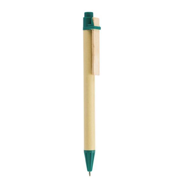 Długopis tekturowy z recyklingu z drewnianym klipsem, z wciskanym mechanizmem, pisze na czarno. Rozmiar: 13,5 x 0,9 cm T1 (tampodruk): 4 x 0,6 Kolor: Zielony