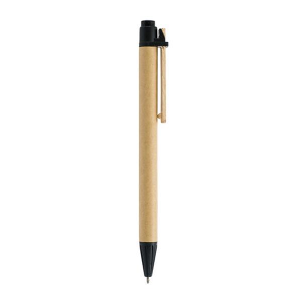 Długopis tekturowy z recyklingu z drewnianym klipsem, z wciskanym mechanizmem, pisze na czarno.