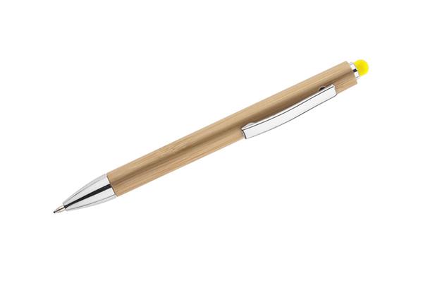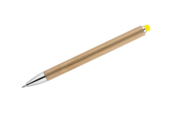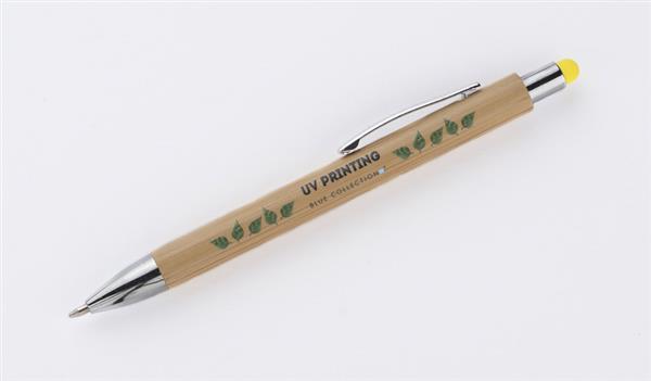 TUSO to długopis, którego korpus został w całości wykonany z bambusa. Chromowane wykończenia nadają mu elegancji. Kolorowa końcówka do obsługi ekranów dotykowych stanowi ciekawą ozdobę. Długopis automatyczny. Wkład typu G2 w kolorze niebieskim.