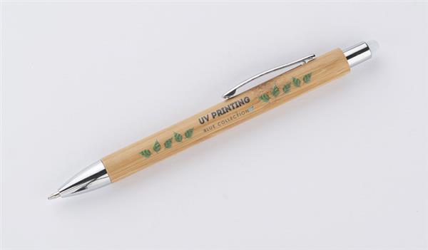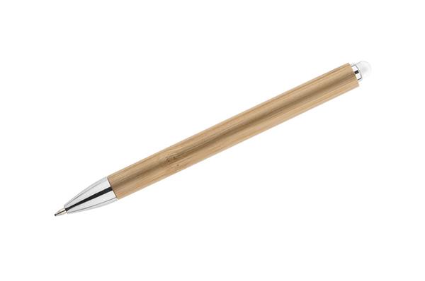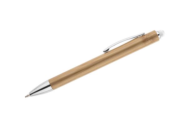 TUSO to długopis, którego korpus został w całości wykonany z bambusa. Chromowane wykończenia nadają mu elegancji. Kolorowa końcówka do obsługi ekranów dotykowych stanowi ciekawą ozdobę. Długopis automatyczny. Wkład typu G2 w kolorze niebieskim.