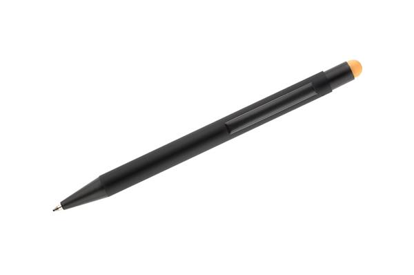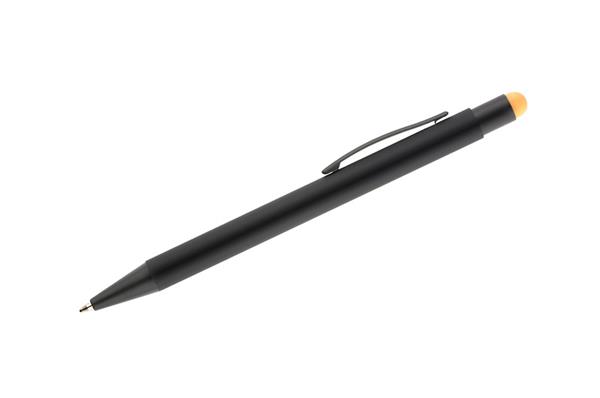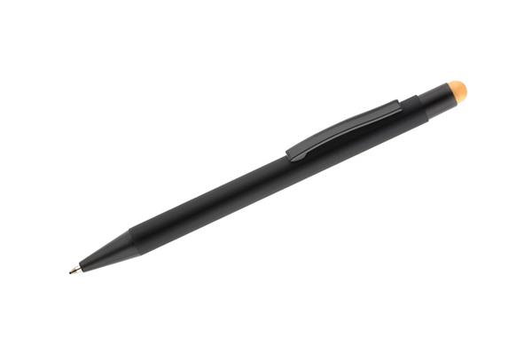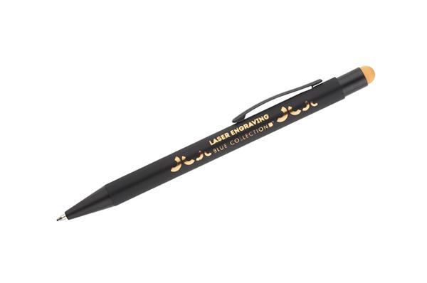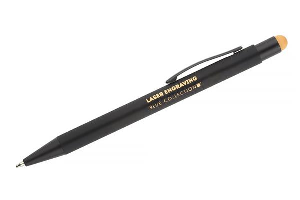 NIRO to długopis z wyjątkowym efektem znakowania. Kolor grawera jest zbliżony do koloru końcówki touch do obsługi ekranów dotykowych. Korpus wykonany z aluminium pokrytego gumowaną powłoką typu soft touch. Wykończenia w kolorze czarnym. Długopis automatyczny. Wkład typu G2 w kolorze niebieskim.