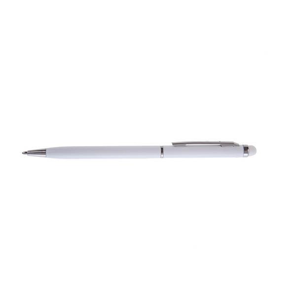 Długopis z kolorowym trzonem o matowym wykończeniu, niewielka średnica nadaje nowoczesnego wyglądu, dopasowana kolorystycznie końcówka touch pen umożliwiająca obsługę ekranów dotykowych, wkład w niebieskim kolorze, produkt wykonany z aluminium