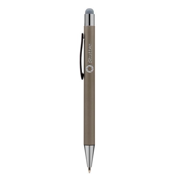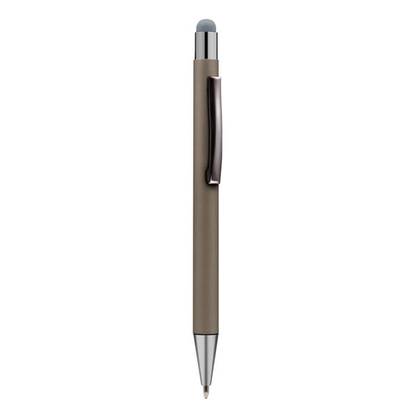 Długopis z kolorowym trzonem i błyszczącymi elementami, końcówka touch pen umożliwiająca obsługę ekranów dotykowych, wkład w niebieskim kolorze, produkt wykonany z aluminium