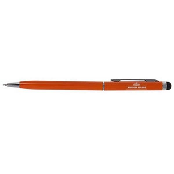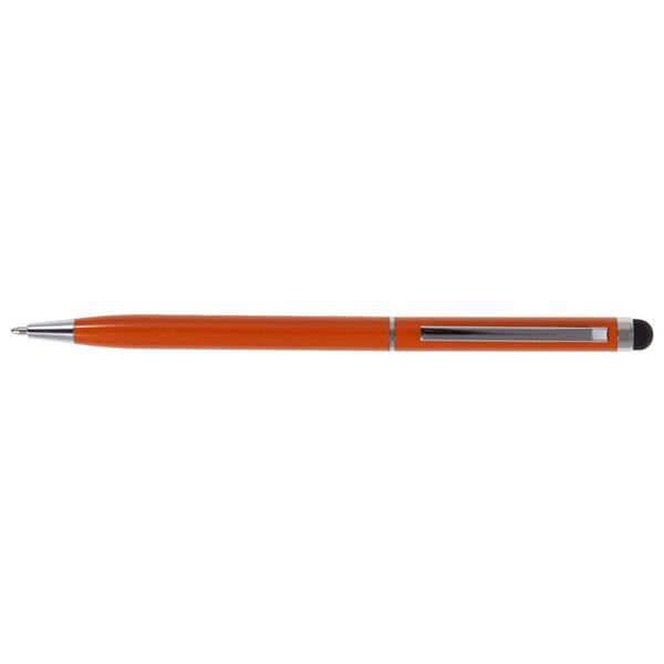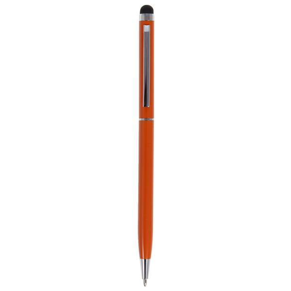 Długopis z kolorowym trzonem i elementami w srebrnym kolorze, niewielka średnica nadaje nowoczesnego wyglądu, końcówka touch pen umożliwiająca obsługę ekranów dotykowych, wkład w niebieskim kolorze, produkt wykonany z aluminium