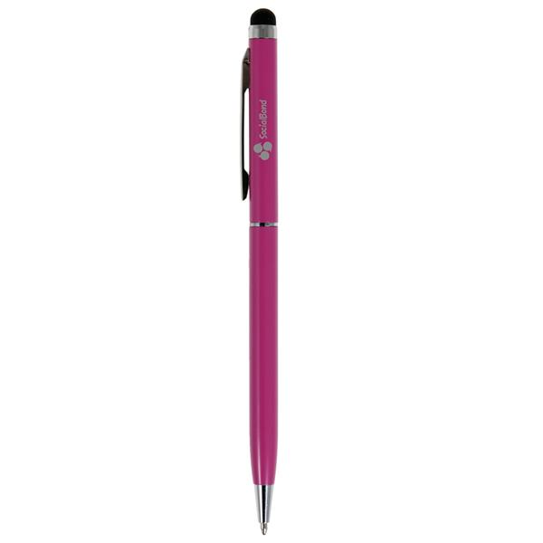 Długopis z kolorowym trzonem i elementami w srebrnym kolorze, niewielka średnica nadaje nowoczesnego wyglądu, końcówka touch pen umożliwiająca obsługę ekranów dotykowych, wkład w niebieskim kolorze, produkt wykonany z aluminium