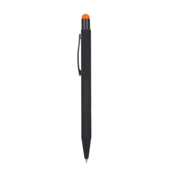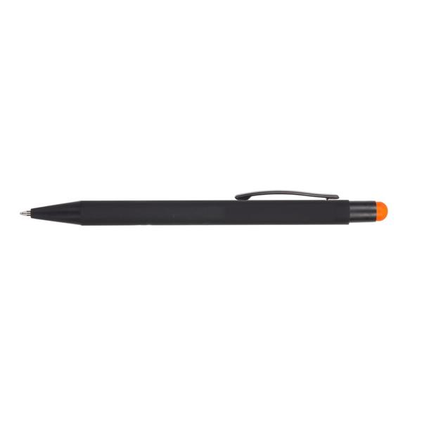 Długopis z czarnym trzonem, posiada gumowe wykończenie, kolorowa końcówka touch pen umożliwiająca obsługę ekranów dotykowych, grawer ukazuje powierzchnię w kolorze zbliżonym do koloru końcówki touch pen lub w kolorze białym, wkład w niebieskim kolorze, produkt wykonany z aluminium
