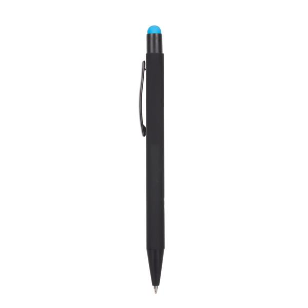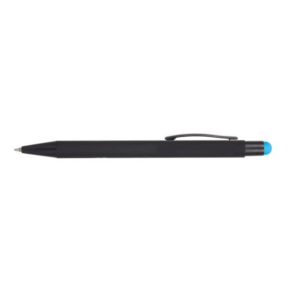 Długopis z czarnym trzonem, posiada gumowe wykończenie, kolorowa końcówka touch pen umożliwiająca obsługę ekranów dotykowych, grawer ukazuje powierzchnię w kolorze zbliżonym do koloru końcówki touch pen lub w kolorze białym, wkład w niebieskim kolorze, produkt wykonany z aluminium