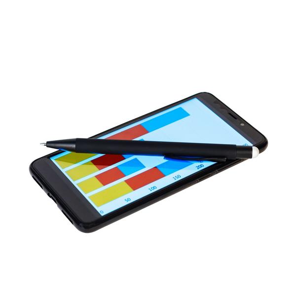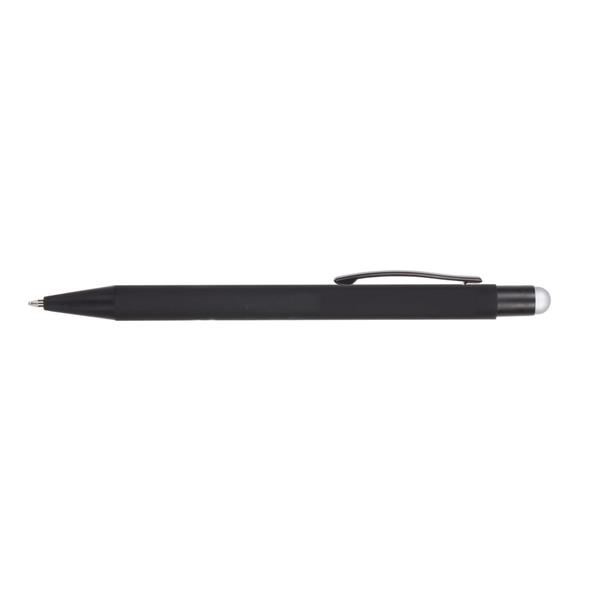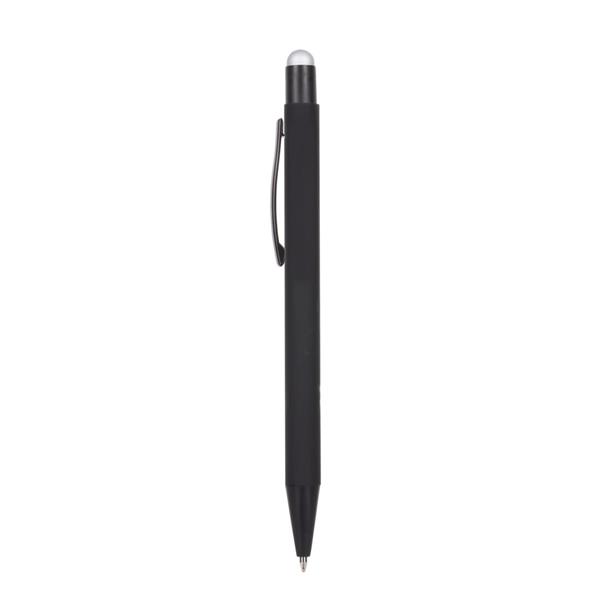 Długopis z czarnym trzonem, posiada gumowe wykończenie, kolorowa końcówka touch pen umożliwiająca obsługę ekranów dotykowych, grawer ukazuje powierzchnię w kolorze zbliżonym do koloru końcówki touch pen lub w kolorze białym, wkład w niebieskim kolorze, produkt wykonany z aluminium