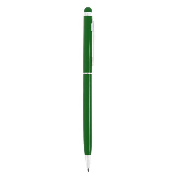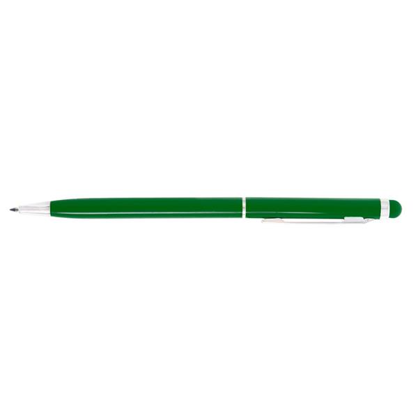 Długopis z kolorowym trzonem o błyszczącym wykończeniu, niewielka średnica nadaje nowoczesnego wyglądu, dopasowana kolorystycznie końcówka touch pen umożliwiająca obsługę ekranów dotykowych, wkład w niebieskim kolorze, produkt wykonany z aluminium