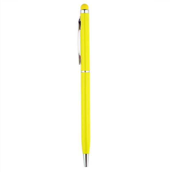 Długopis z kolorowym trzonem o błyszczącym wykończeniu, niewielka średnica nadaje nowoczesnego wyglądu, dopasowana kolorystycznie końcówka touch pen umożliwiająca obsługę ekranów dotykowych, wkład w niebieskim kolorze, produkt wykonany z aluminium