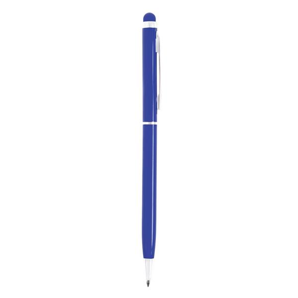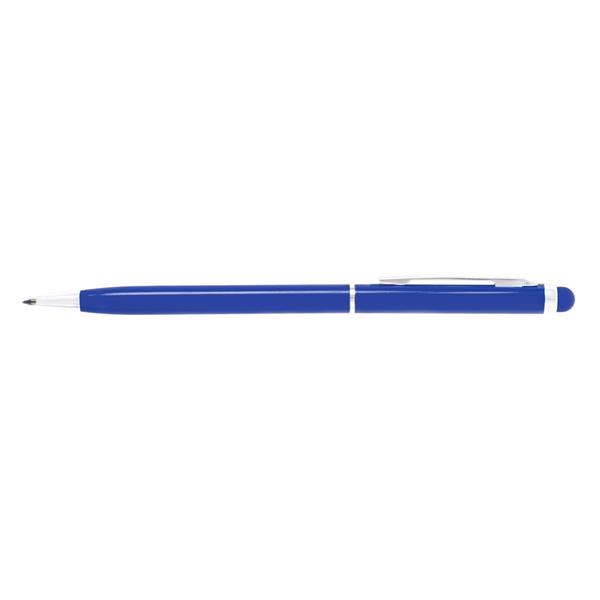 Długopis z kolorowym trzonem o błyszczącym wykończeniu, niewielka średnica nadaje nowoczesnego wyglądu, dopasowana kolorystycznie końcówka touch pen umożliwiająca obsługę ekranów dotykowych, wkład w niebieskim kolorze, produkt wykonany z aluminium