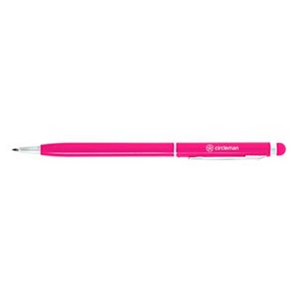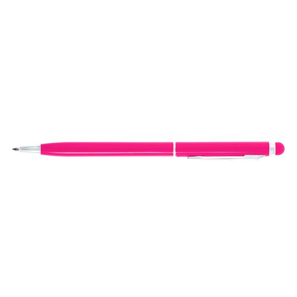 Długopis z kolorowym trzonem o błyszczącym wykończeniu, niewielka średnica nadaje nowoczesnego wyglądu, dopasowana kolorystycznie końcówka touch pen umożliwiająca obsługę ekranów dotykowych, wkład w niebieskim kolorze, produkt wykonany z aluminium