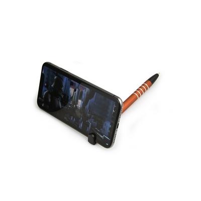 Długopis z kolorowym trzonem i elementami w srebrnym kolorze, specjalny klip może służyć jako stojak na telefon, końcówka touch pen umożliwiająca obsługę ekranów dotykowych, wkład w niebieskim kolorze, produkt wykonany z aluminium i plastiku