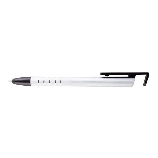 Długopis z kolorowym trzonem i elementami w srebrnym kolorze, specjalny klip może służyć jako stojak na telefon, końcówka touch pen umożliwiająca obsługę ekranów dotykowych, wkład w niebieskim kolorze, produkt wykonany z aluminium i plastiku
