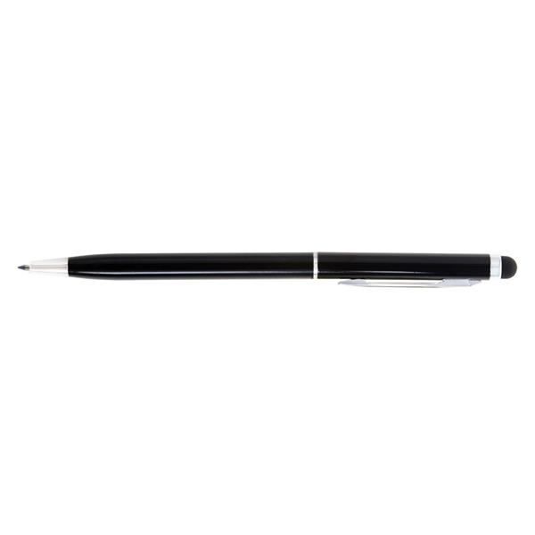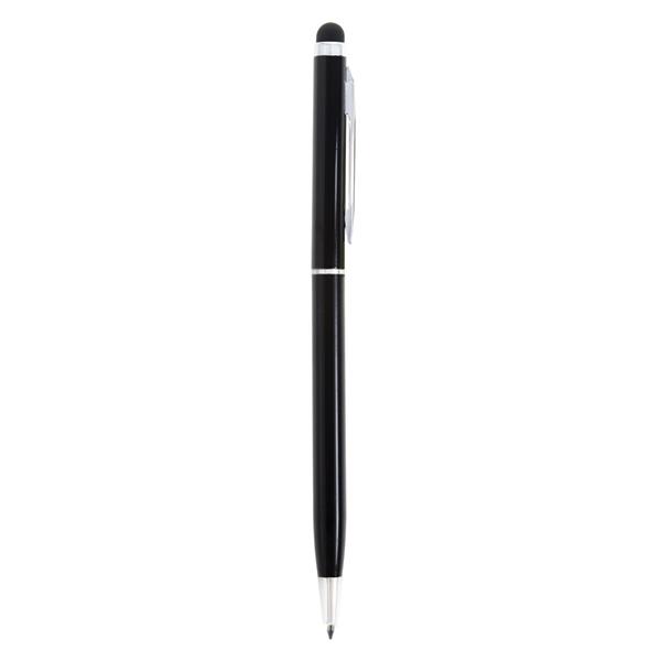 Długopis z kolorowym trzonem o błyszczącym wykończeniu, niewielka średnica nadaje nowoczesnego wyglądu, dopasowana kolorystycznie końcówka touch pen umożliwiająca obsługę ekranów dotykowych, wkład w niebieskim kolorze, produkt wykonany z aluminium